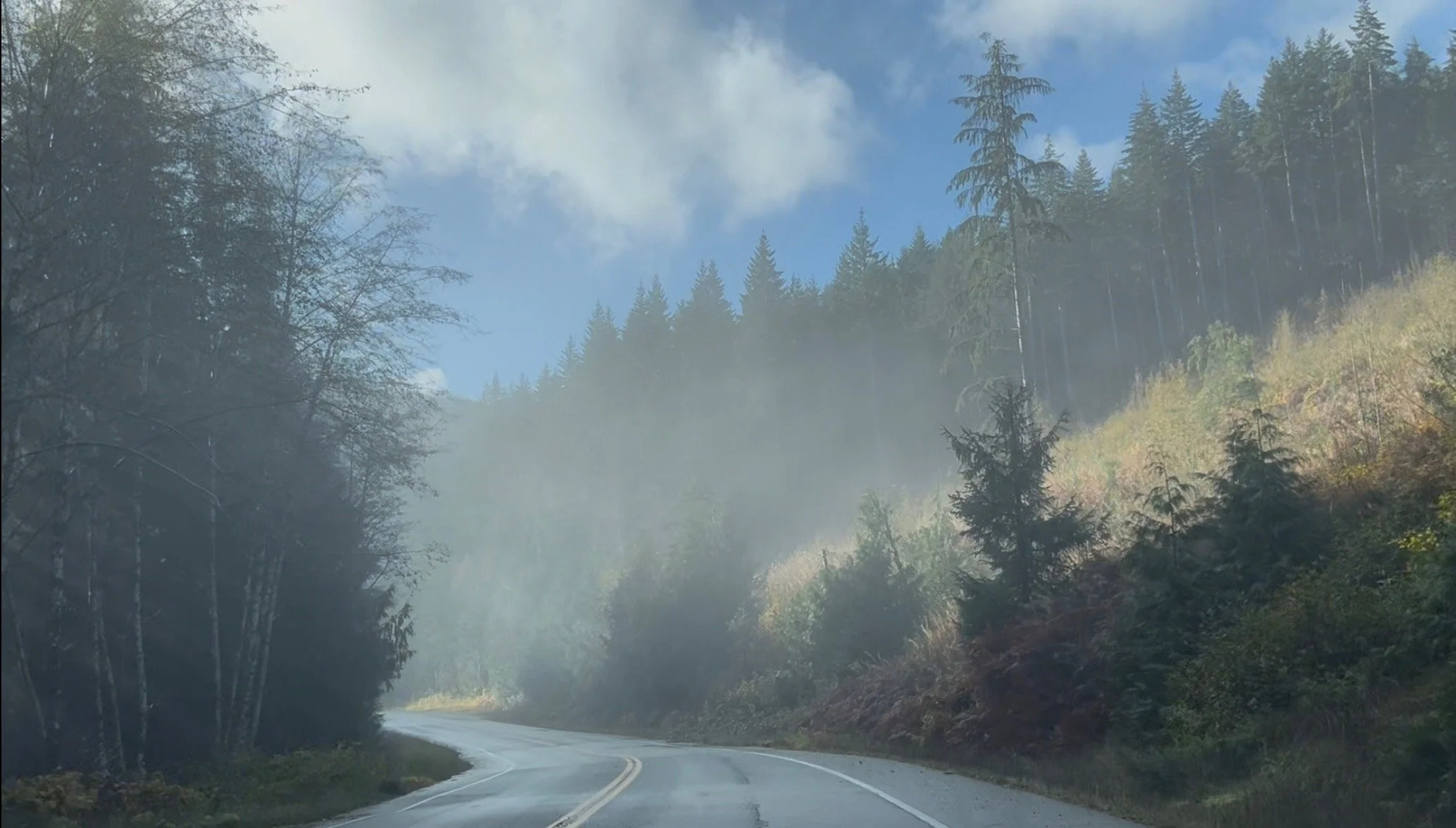 Bouts of somewhat heavy rain and fog come late into the day as we drive from Victoria to Comox, north into Vancouver Island, while the ocean scent rotates between salty and woody and sweet again.