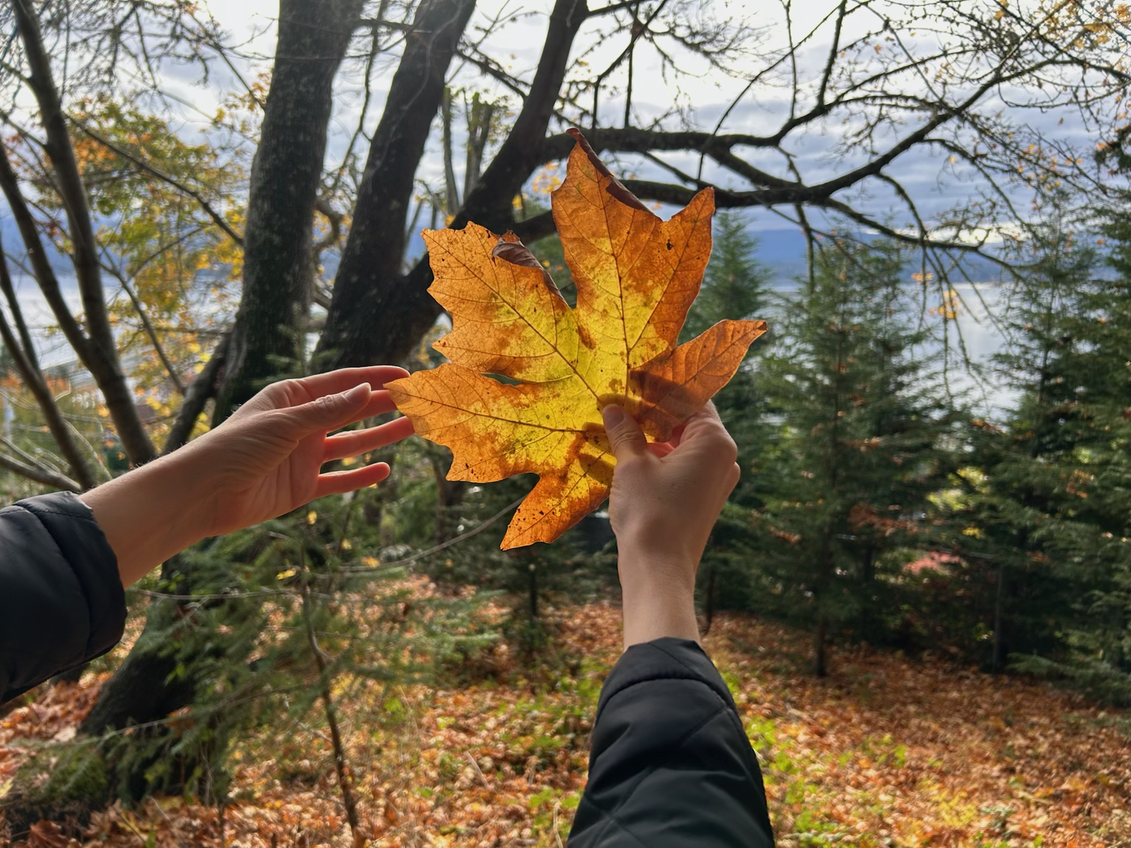 My hands and a very large Maple among the autumn leaves falling hiking Comox Valley.