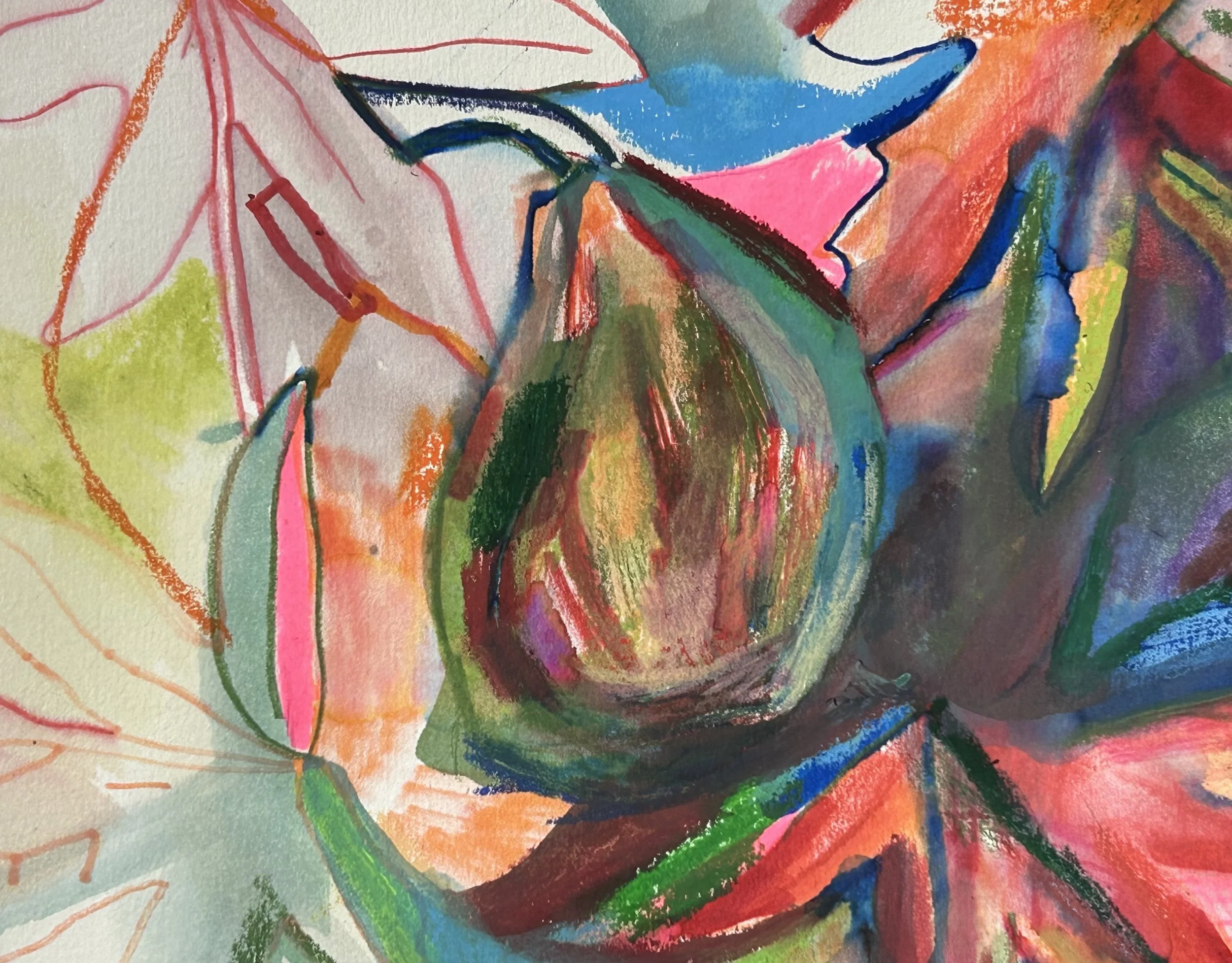 Maple and pears in my sketchbook in pencils and gouache display a autumn palette.